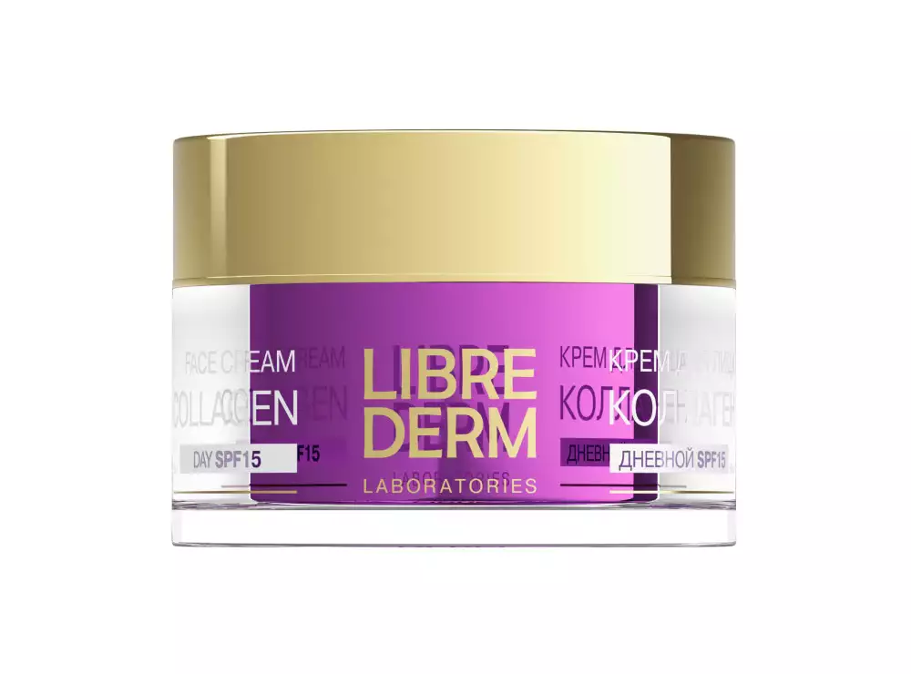 Дневной крем для восстановления сияния и ровного цвета кожи Collagen Peptide Librederm с SPF−15 закрывает сыворотку и является хорошей основой под макияж, помогая коже синтезировать выработку коллагена — строительного материала клеток, отвечающего за ее упругость и молодость.