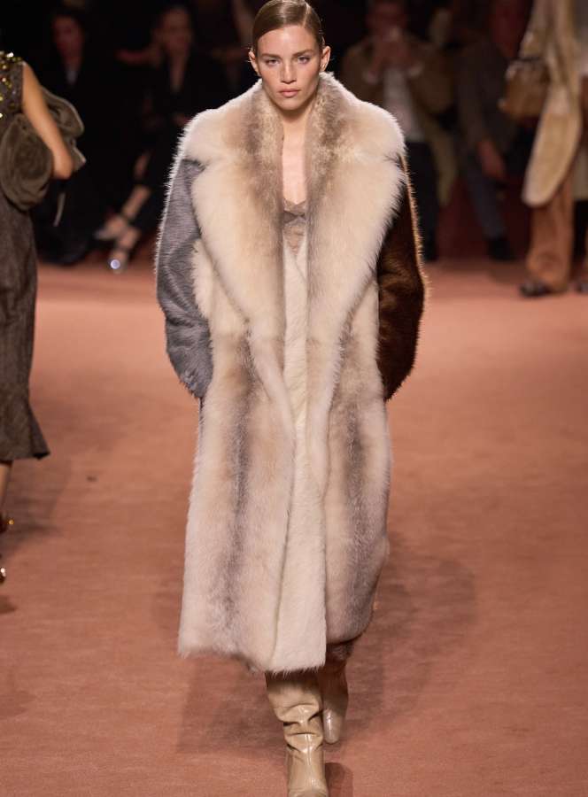 Мех с выраженной фактурой остается ключом к модному самовыражению. Плюш, букле-эффект, тедди, зебра-стричь, диагональная стрижка под шеврон — все это дает глубину цвета и прячет заломы. Еще одна линия тренда — комбинированные модели. Кожаные кокетки, замшевые вставки, стеганые панели, микс матовых и глянцевых поверхностей. Такие шубы не требуют сложного стайлинга, достаточно монохромной базы — тотал-черный, молочный, серый — и одной детали вроде ремня на талии или шапки-бини крупной вязки. Если хочется принта, выбирайте спокойную «соль и перец» или мягкий леопард в приглушенных тонах, они легче вписываются в гардероб, чем жесткие контрасты.
