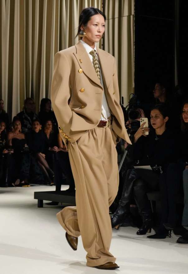 Галстук легко вписывается под жилет, трикотажный топ или тонкий джемпер с V-вырезом. Важно, чтобы он выглядывал продуманным аксессуаром, а не случайностью. Кстати, его можно декорировать разными способами: от очень актуального жемчуга до галстучных булавок и роскошных винтажных брошей. Следите за длиной: кончик галстука должен касаться линии пояса — так вертикаль остается аккуратной даже в сложной многослойности.