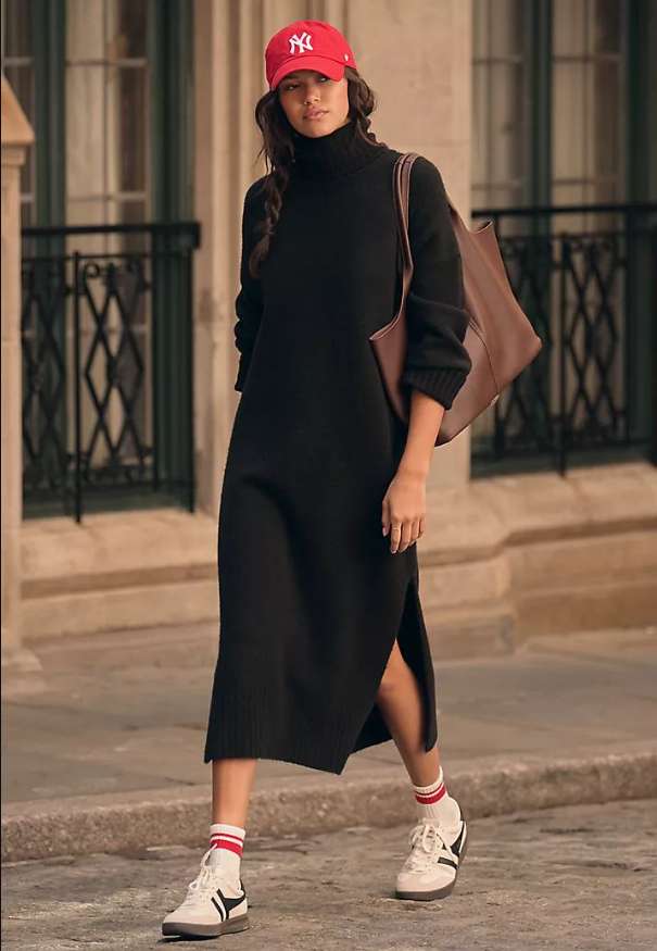 Это отличный универсал на осень, который работает сам по себе. Днем носите с плотными колготками и грубыми ботинками или кедами, вечером — с замшевыми ботфортами и длинным пальто. Чтобы силуэт не потерялся, добавьте пояс на талии. Хорошо играют вертикали: длинный шарф, контрастная сумка-конверт, пальто прямого кроя. Если выбираете узор, пусть он будет спокойным, например тонкая полоска или мелкая рисовая вязка.